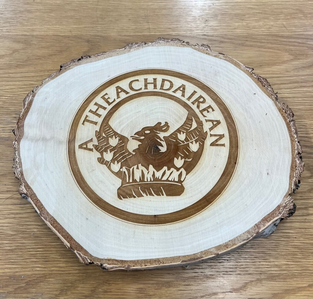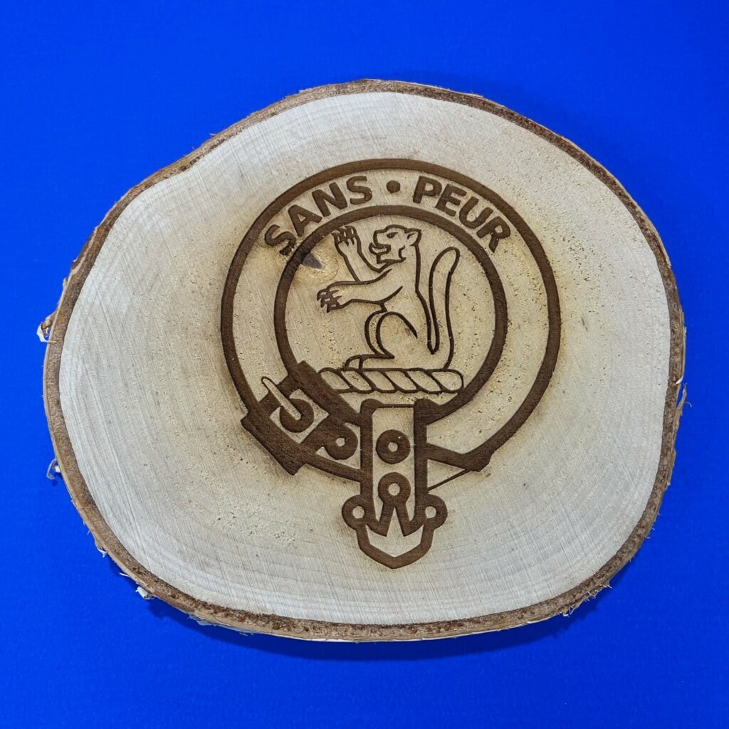 We combine the ancient clan crest with nature by laser engraving the design onto a thick slice of birch wood. The tree slices include the bark, resulting in a very natural looking product showing family heritage and tradition.