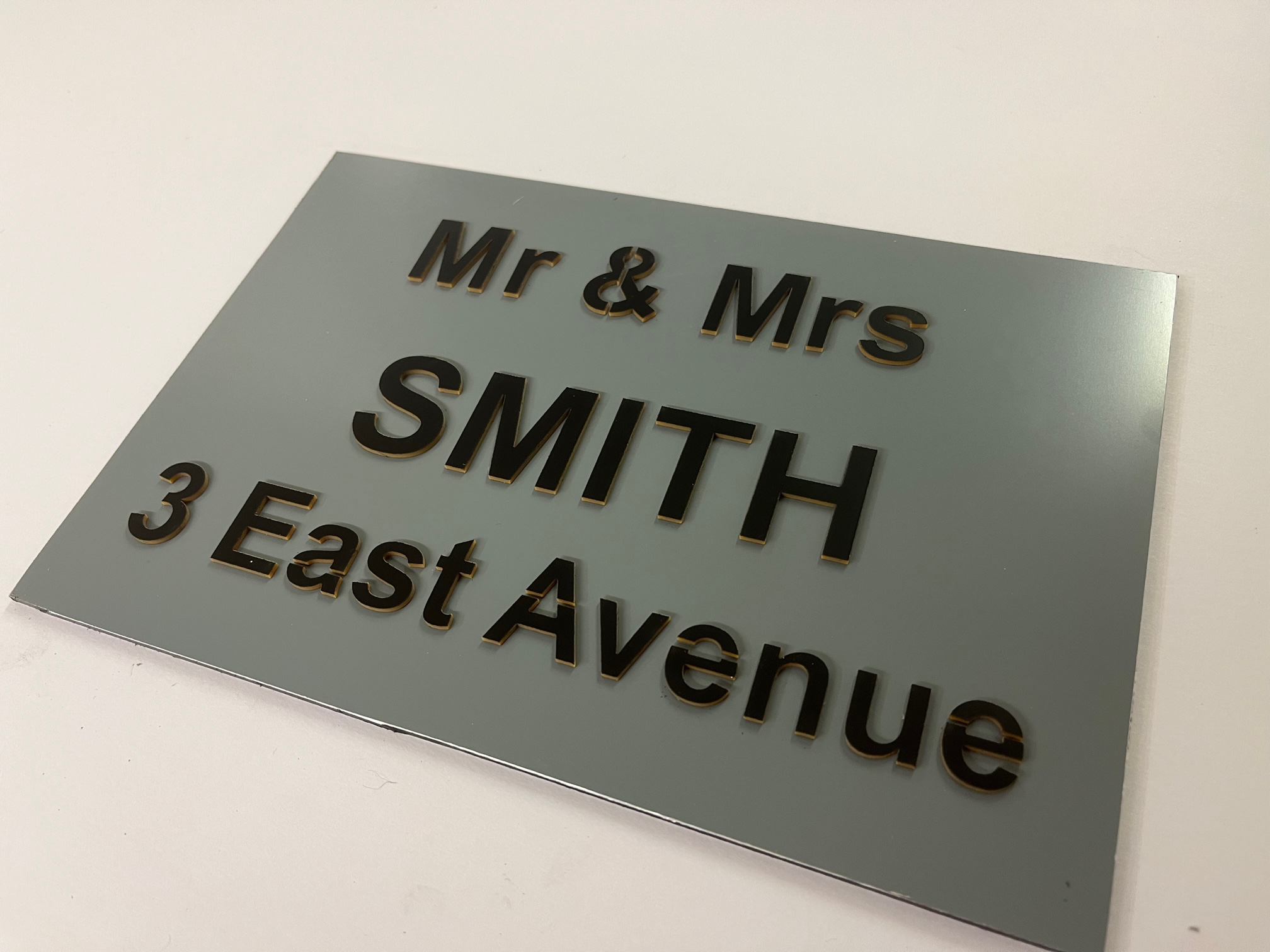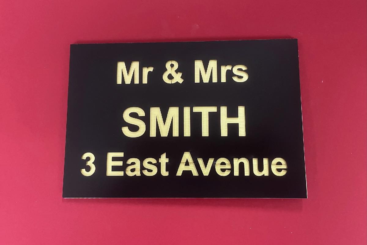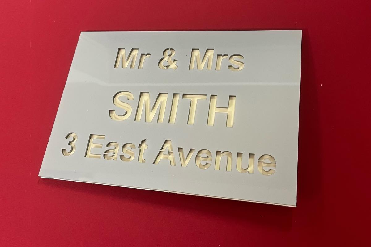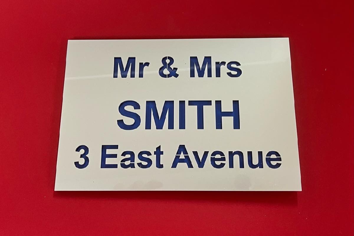 Our Isla range features both your name and address. Produced with a modern acrylic surface, laser cut to show a coloured back plate.