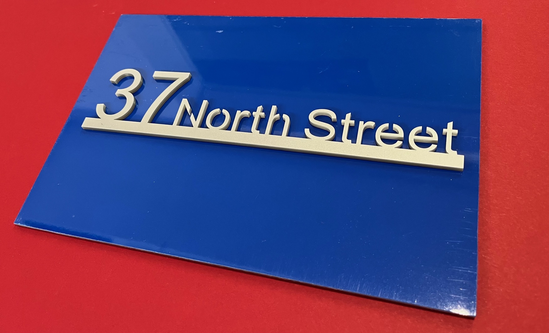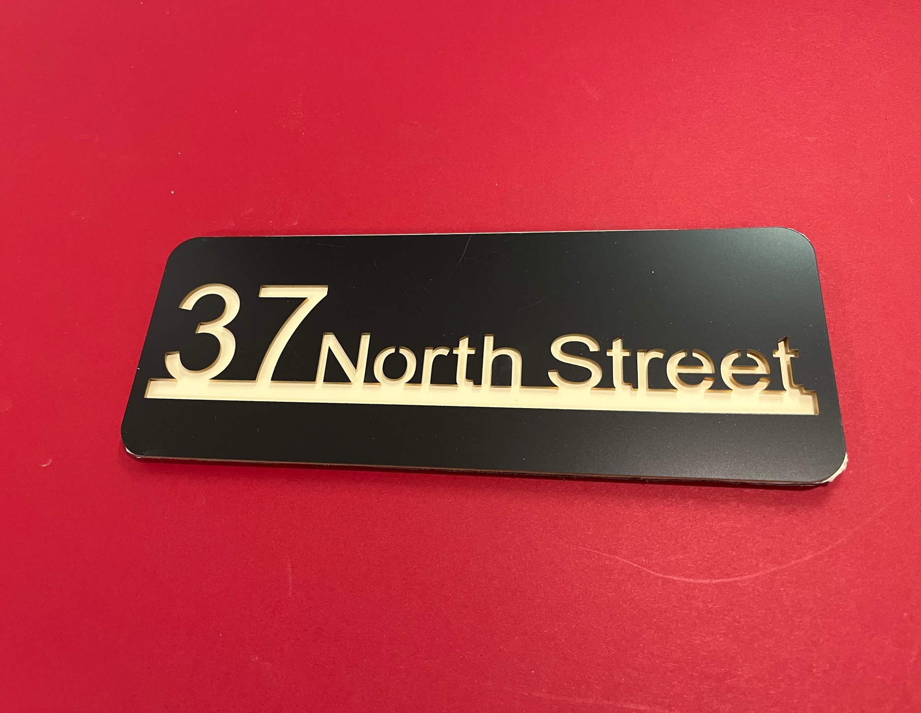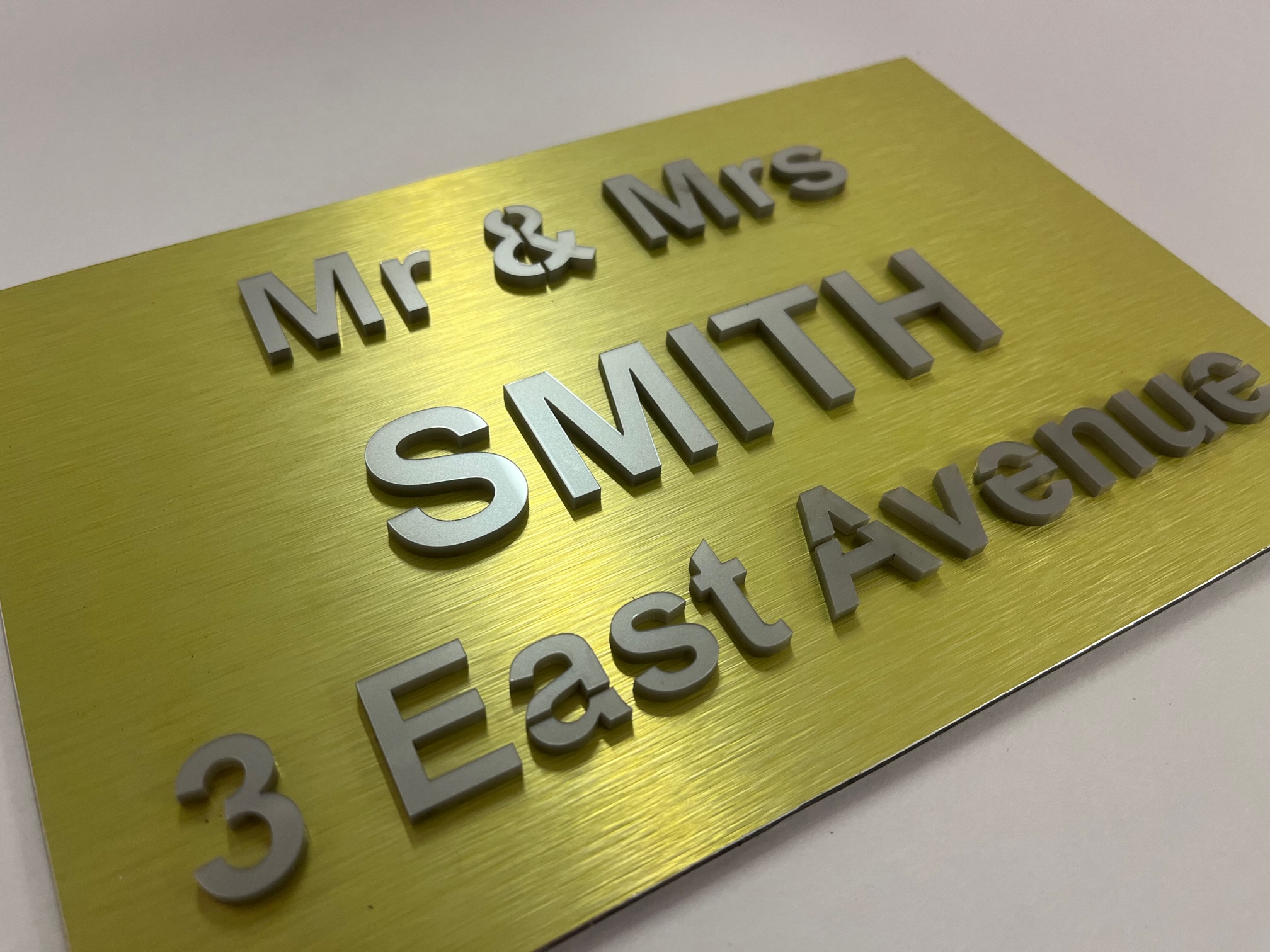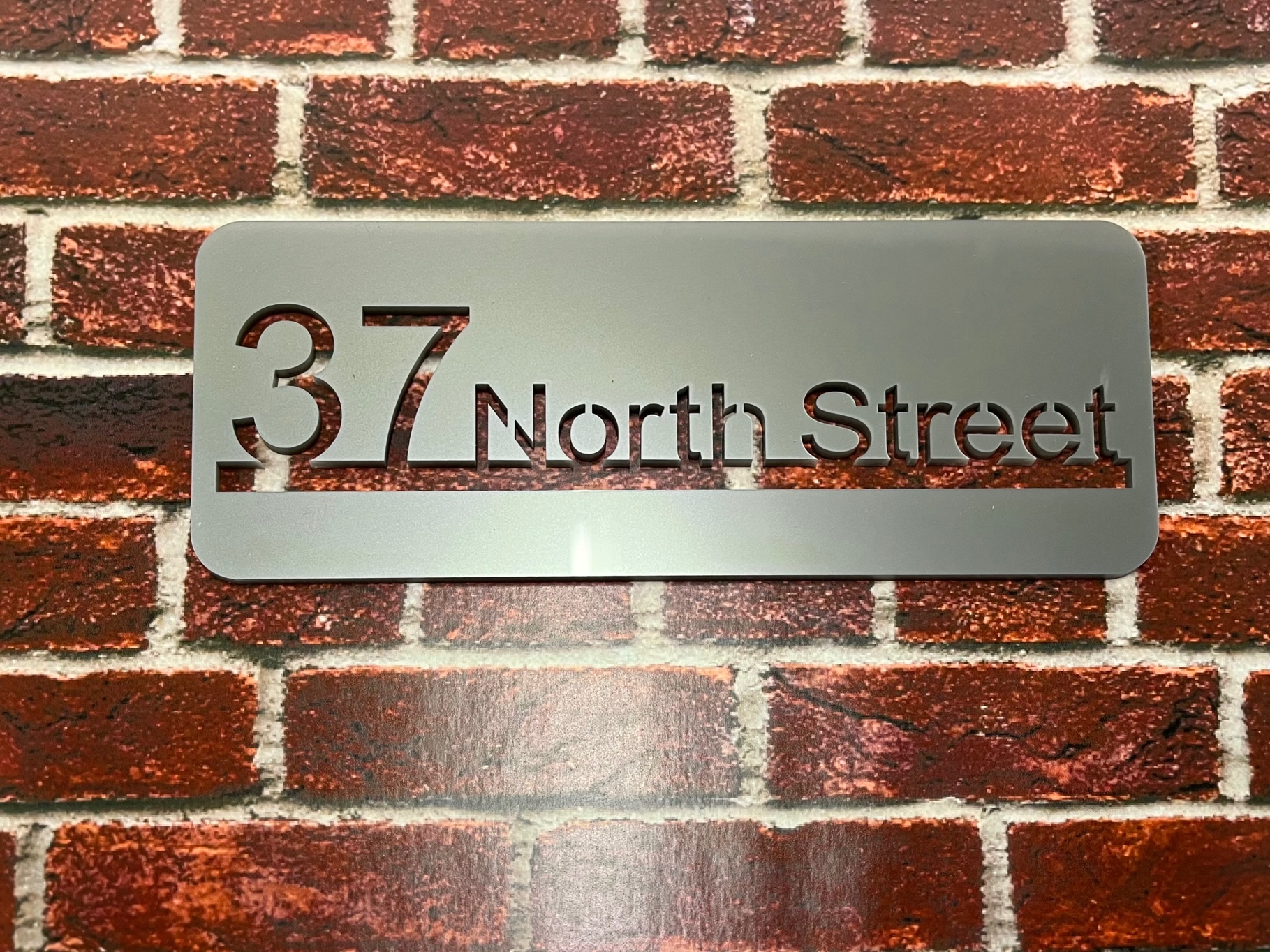 Our Isla range features both your name and address. Produced with a modern acrylic surface, laser cut to show a coloured back plate.