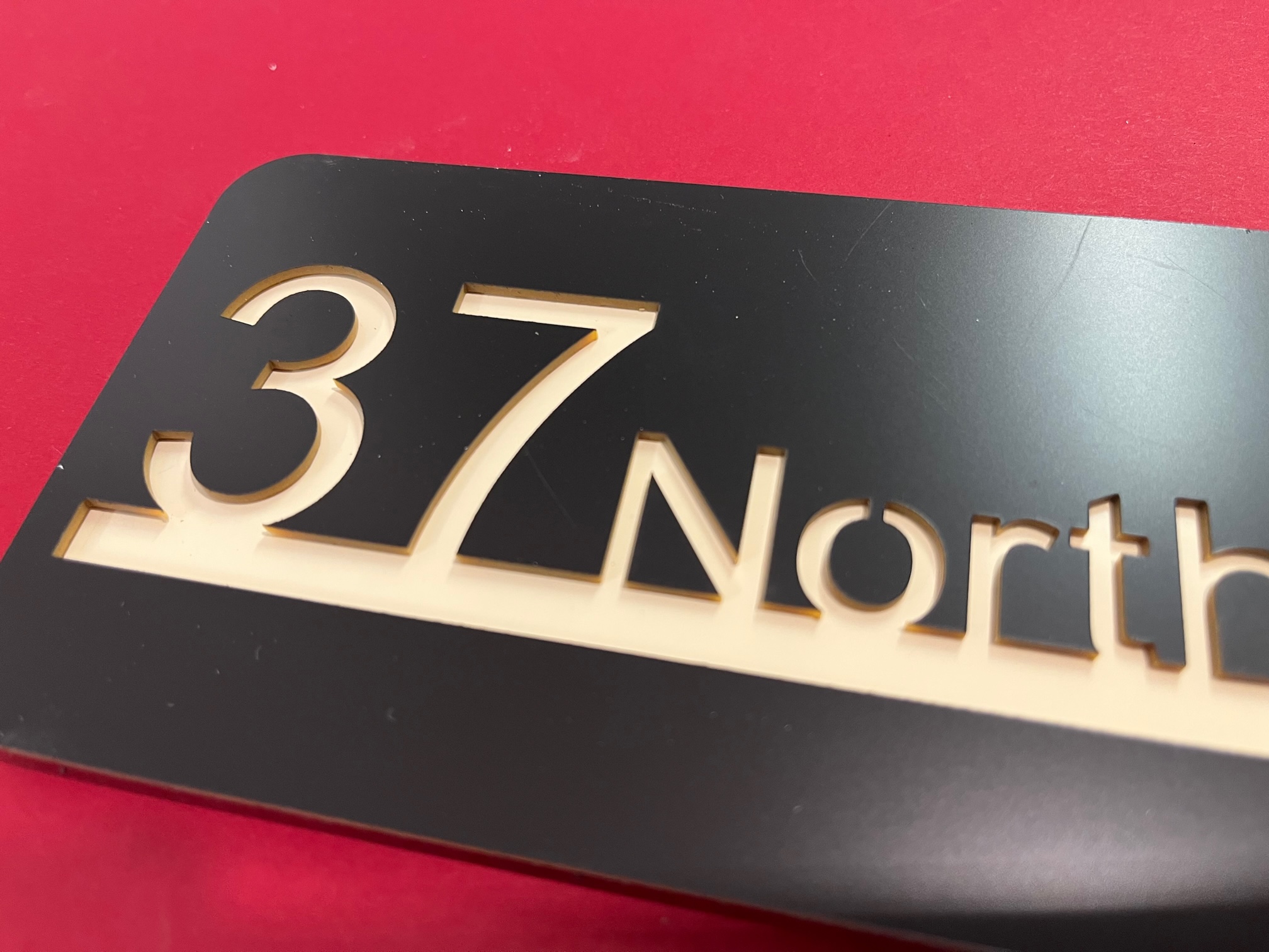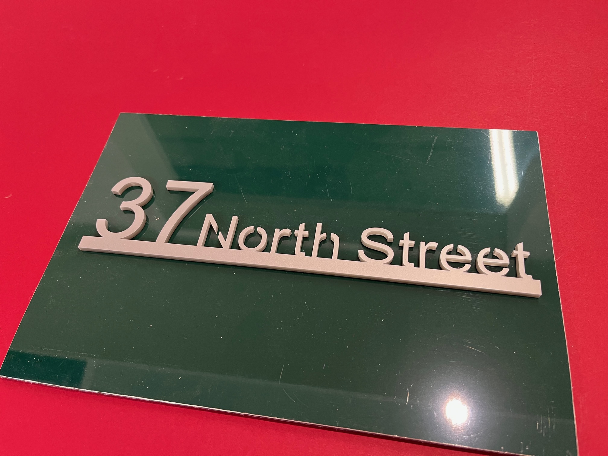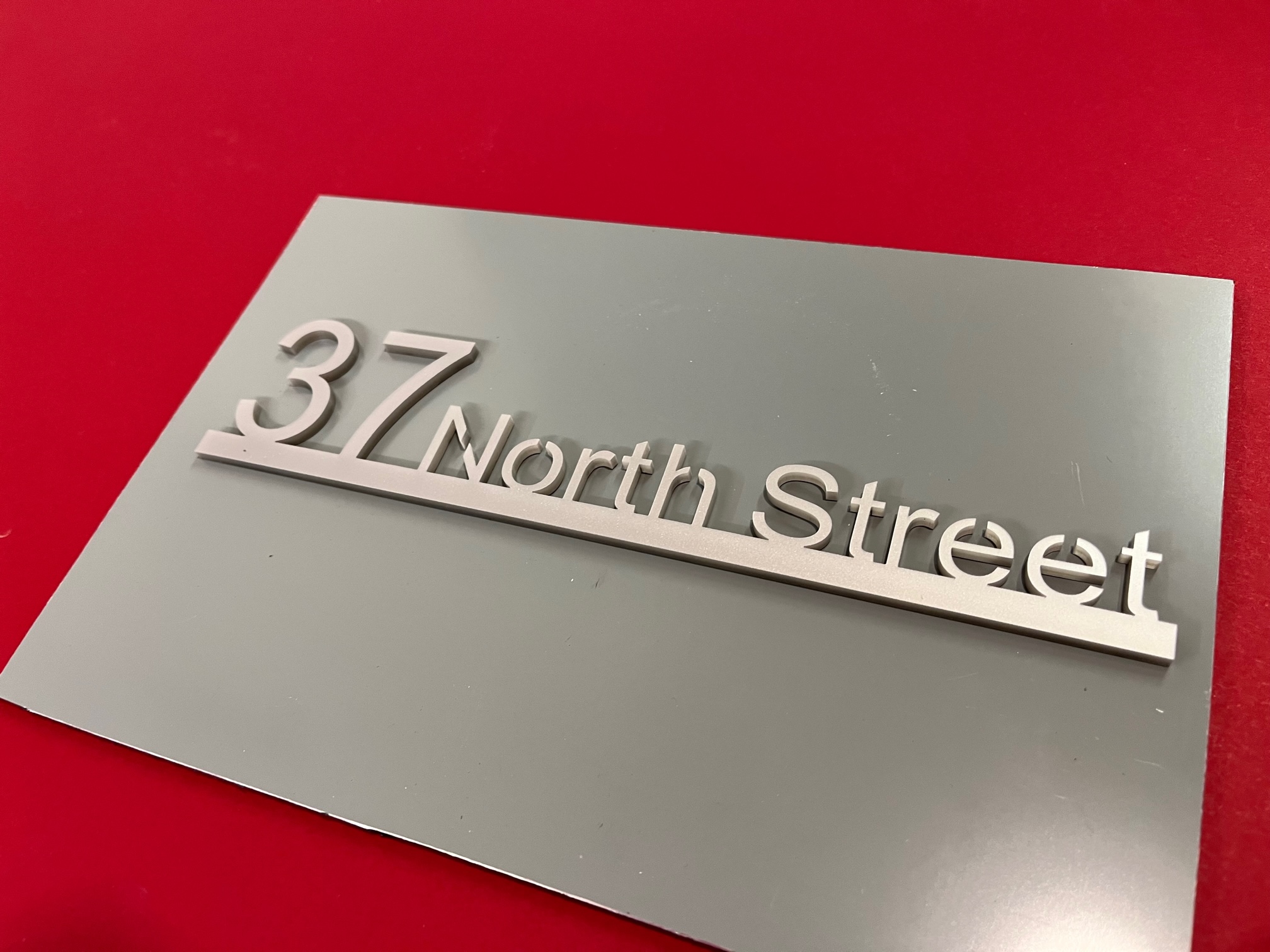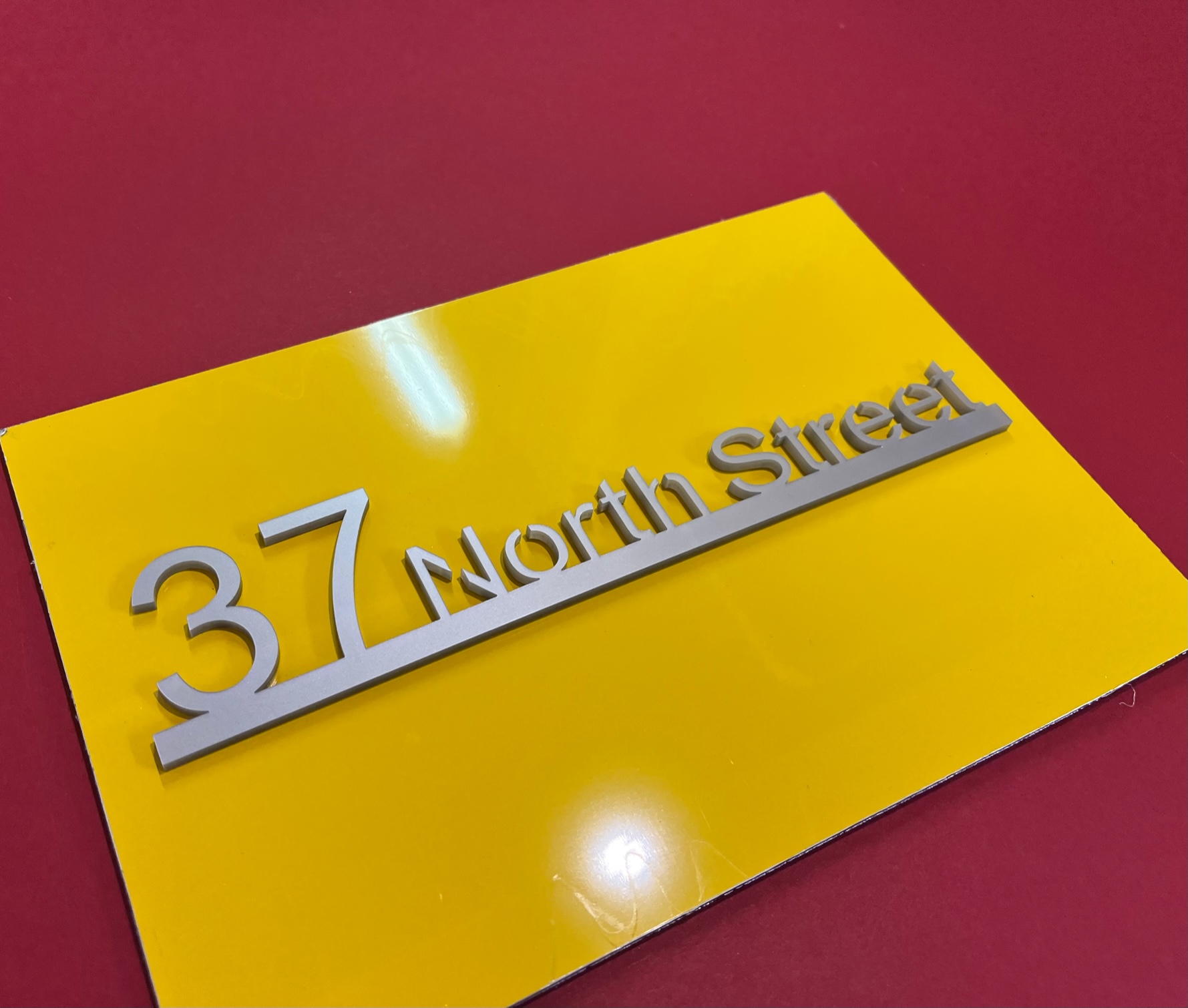 Our Isla range features both your name and address. Produced with a modern acrylic surface, laser cut to show a coloured back plate.